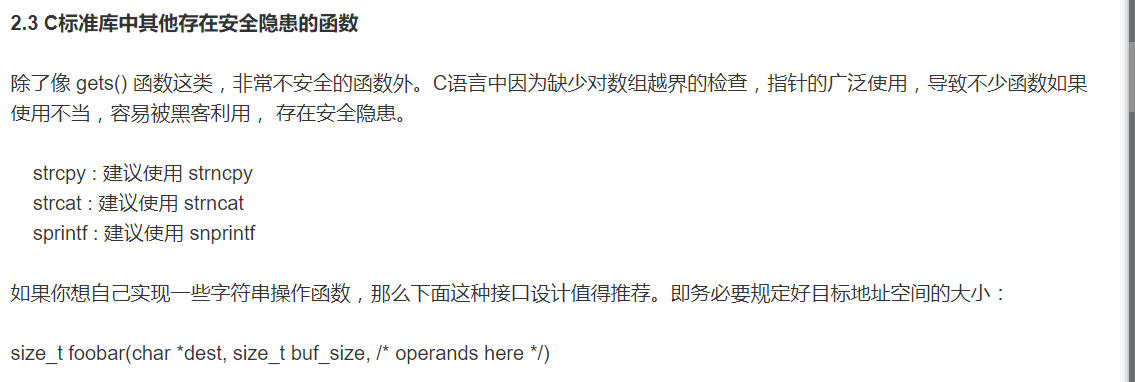 gets()函数不检查目标数组是否能够容纳输入,分配空间不足会导致数组越界,会造成缓冲区溢出的问题,内存中原代码被覆盖等问题。缓存溢出有导致程序崩溃的可能性,或原有数据被恶意代码覆盖从而执行攻击者的指令。著名的“蠕虫”病毒的原理就是用很长的数据覆盖原有数据导致崩溃(?没有查到相关资料证明)。